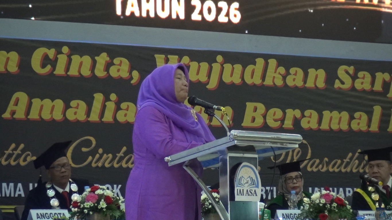 Rektor IAIASA, Dr. KH. Eno Syafrudien, M.Si, dalam sambutannya menyampaikan rasa syukur atas terselenggaranya wisuda tahun akademik 2026 yang mengusung tema "Cinta Wujudkan Sarjana Berilmu Amaliah dan Beramal Ilmiah". Beliau mengucapkan terima kasih kepada para tamu undangan serta para orang tua yang telah mempercayakan IAIASA sebagai tempat putra-putri mereka untuk belajar mengetahui dan belajar bersyukur kepada Allah SWT hingga meraih gelar akademik. Secara khusus, Rektor memberikan apresiasi kepada Kopertais Wilayah 1 atas pembinaan dan pengawasannya sehingga IAIASA mampu meningkatkan kualitas kampus melalui alih bentuk dari sekolah tinggi menjadi institut yang kini memiliki 6 prodi S1 dan 1 prodi S2.